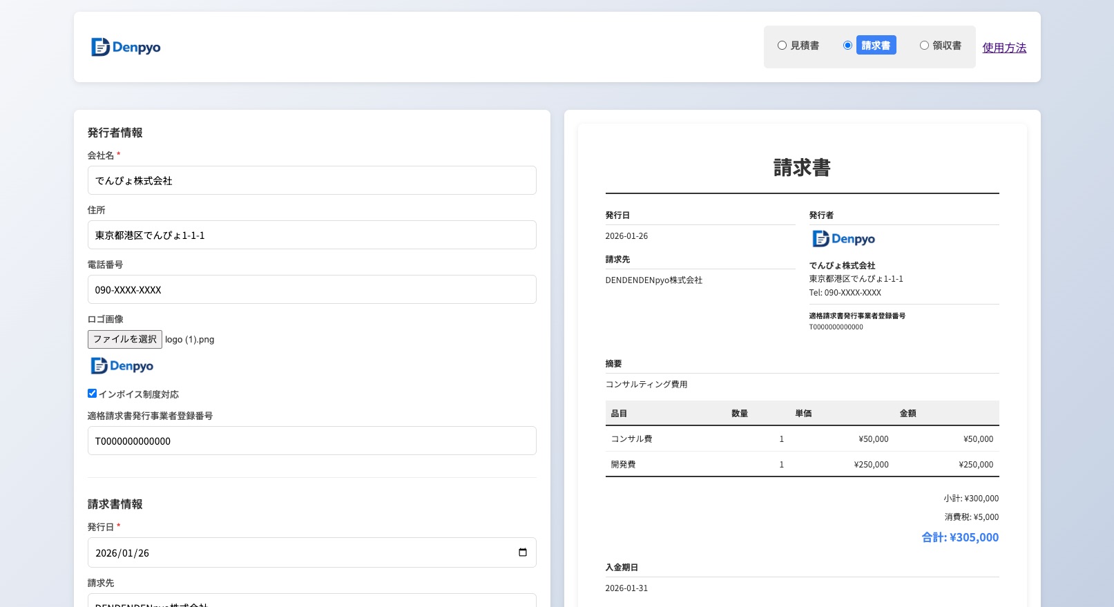 見積書、請求書、領収書の3つの文書タイプに対応。ラジオボタンで簡単に切り替え可能です。